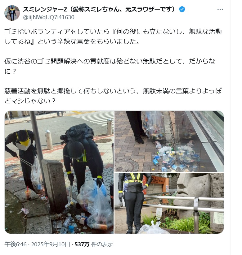 | … | 16925/09/12(金)15:25:13No.1352411219+心無い言葉を浴びせるやつはこういうゴミ拾いしてくれている人がいるから景観が保たれているということを理解できていない |