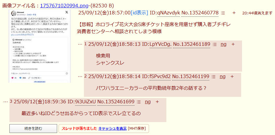 【悲報】ホロライブ花火大会S席チケット座席を用意せず購入者ブチギレこのスレは古いので、もうすぐ消えます。
