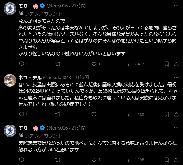 | … | 5025/09/12(金)19:22:47 ID:v73Oc.y.No.1352470965そうだねx5これ前日の雨で泥だらけなのがどうしても解消できなかったから代替席もちゃんと用意されたと記憶しているんだが |