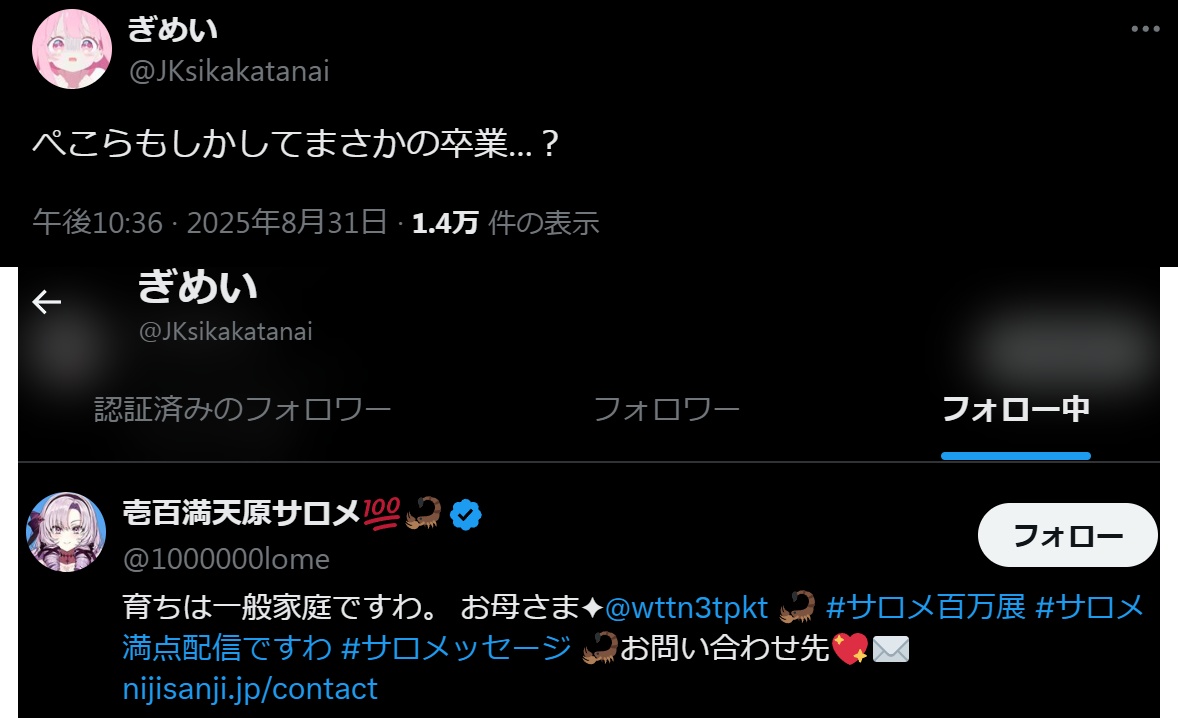 | … | 1725/09/12(金)19:06:05 ID:rdmnCuUwNo.1352464081そうだねx9>にじさんじ公式🌈🕒 @nijisanji_app (2025/09/12 17:30:32) |