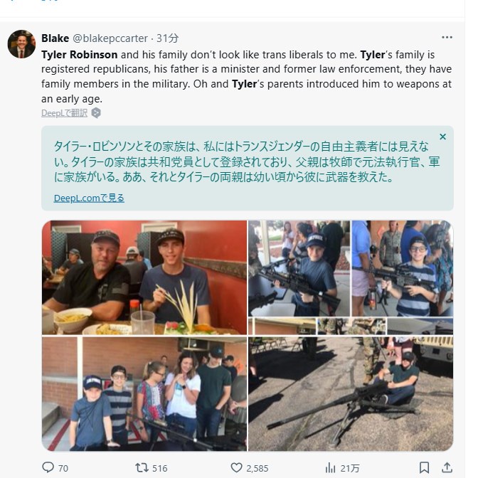 | … | 50625/09/13(土)01:54:41No.1352639074そうだねx1犯人はパパにチャーリー・カークに対する不満を述べてたらしいけど |