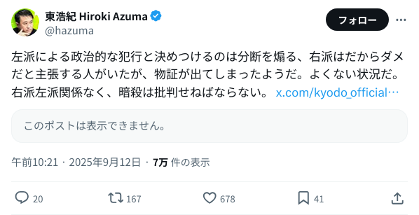 | … | 51025/09/13(土)01:56:24No.1352639375そうだねx1>推定犯人右翼なん…? |
