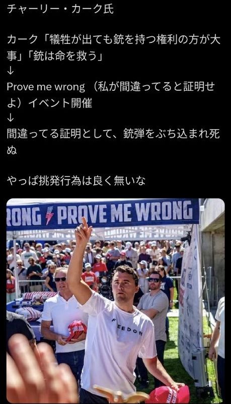 | … | 3725/09/13(土)00:48:45No.1352623671そうだねx10>トランプに寄付してたけど殺されたやつのことは偽の保守だと批判してたらしい |