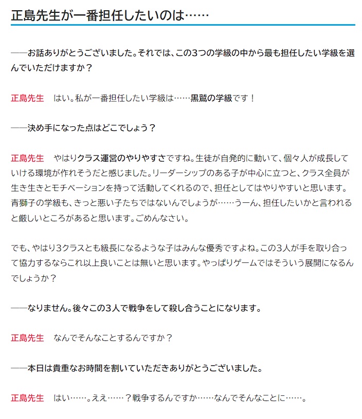 | … | 7725/09/13(土)13:54:38No.1352749783そうだねx3スタッフ「彼らは卒業後戦場で殺し合いを始めることになります」 |