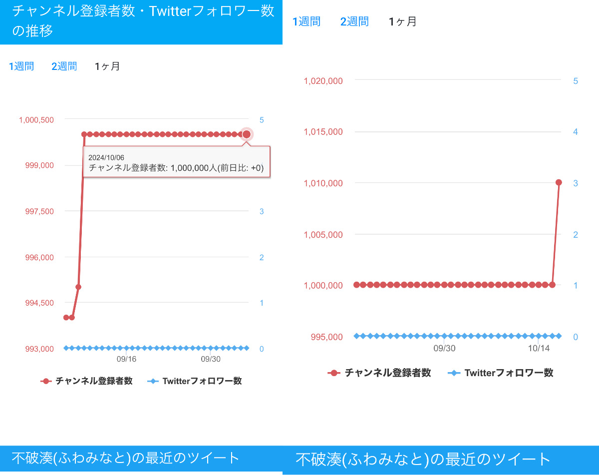 | … | 4825/09/14(日)11:13:43No.1353059468+>100万で止まったらホロライブへのたたき棒として使えないじゃんどうすんの |