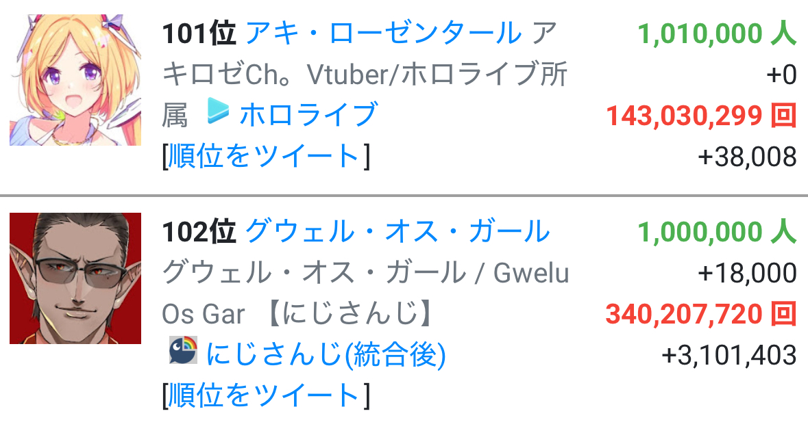 | … | 15625/09/14(日)13:59:38No.1353106733そうだねx4不破も100万行った途端に鈍化したからにじさんじの愛は実績としてそういうもんなんだ |
