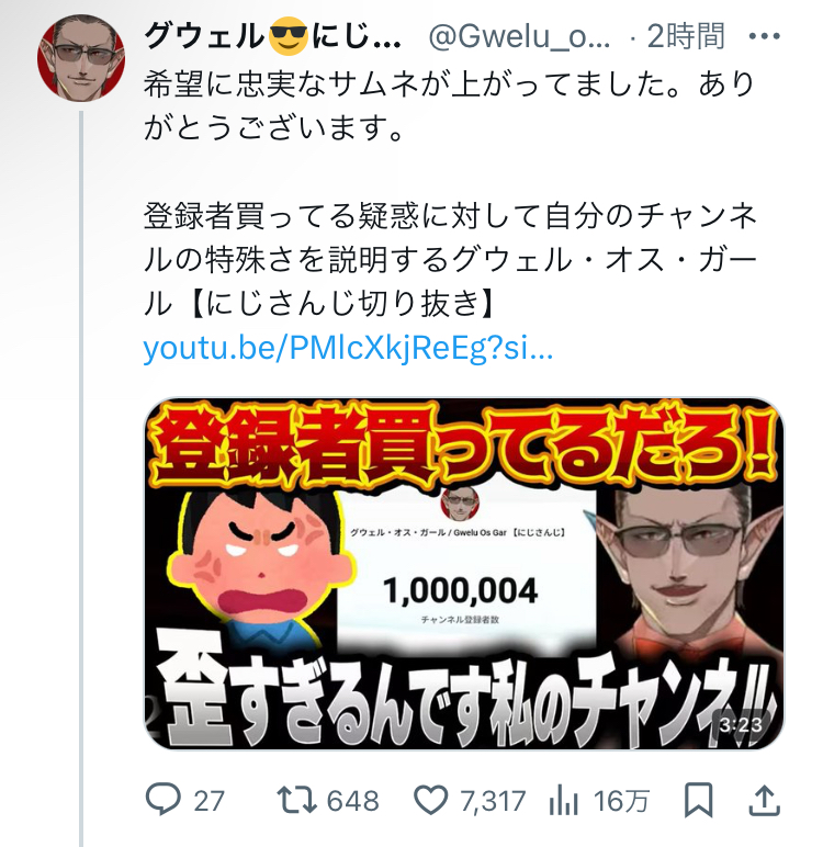 | … | 9625/09/14(日)13:14:54No.1353094313そうだねx4>グウェルの突如として増えた50万人弱の登録者は界隈外から来てるらしいな |