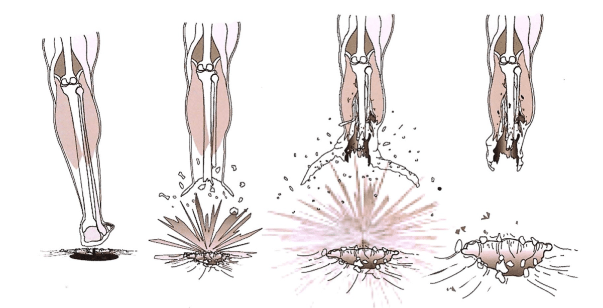 このとき骨は耐えられないので破砕されて衝撃波のねじれで下腿ごと吹っ飛んでいく