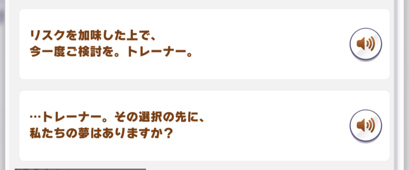 | … | 7525/09/14(日)19:26:56 ID:ipS1ZTmYNo.1353206406+連続出走ボイスのオンオフ欲しいですよね…心が痛みます |