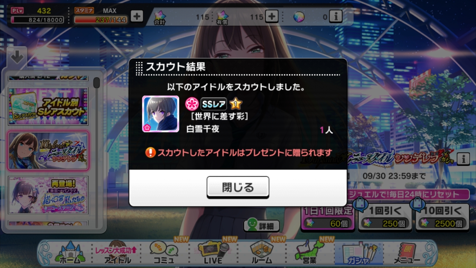 | … | 125/09/15(月)00:04:42No.1353325989+最後の最後にしぶりんきてなんとか天井までに2人引けた |