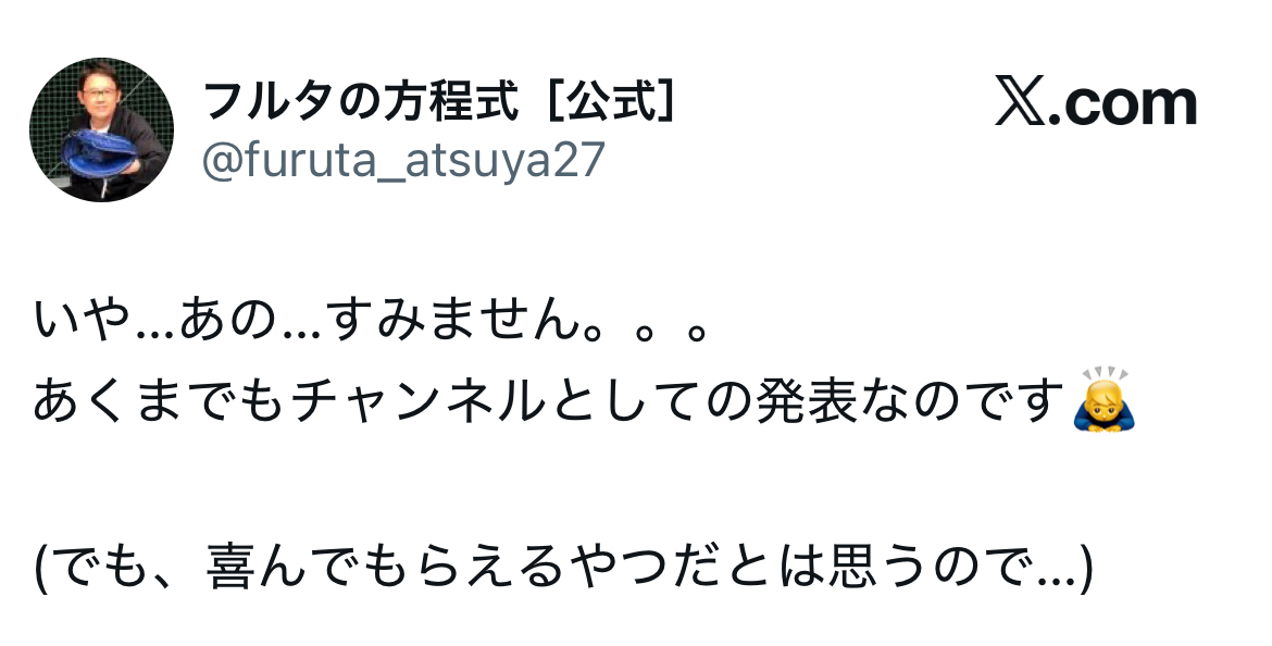 | … | 89025/09/15(月)21:05:14 ID:byeOczNwNo.1353593144そうだねx4https://x.com/furuta_atsuya27/status/1967525260481454458?s=46 |