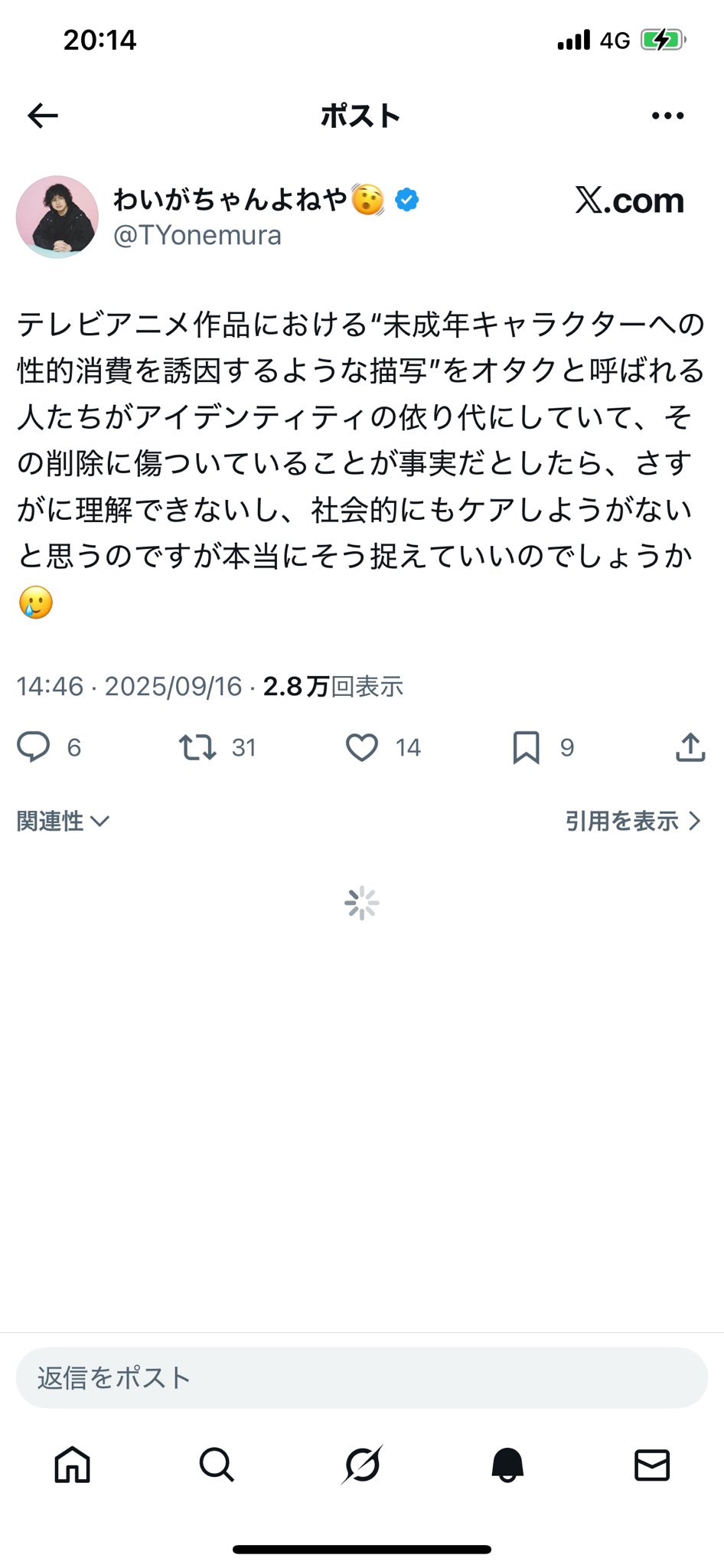 | … | 55325/09/16(火)20:46:26No.1353900455そうだねx1吉田さんは至極真っ当なことしか言ってないのに脳みそ下半身オタクが騒ぎすぎだ |