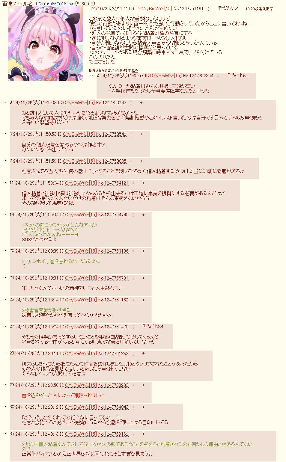 | … | 32125/09/17(水)02:09:12No.1354001761+まあたぶんだけどここでさんざん叩かれた「」かとしあきのなり損ないが日頃の鬱憤晴らしをしようとして失敗したんだろうなって |