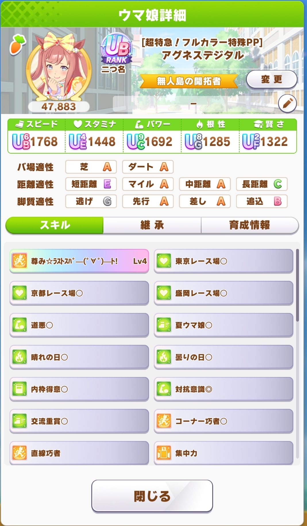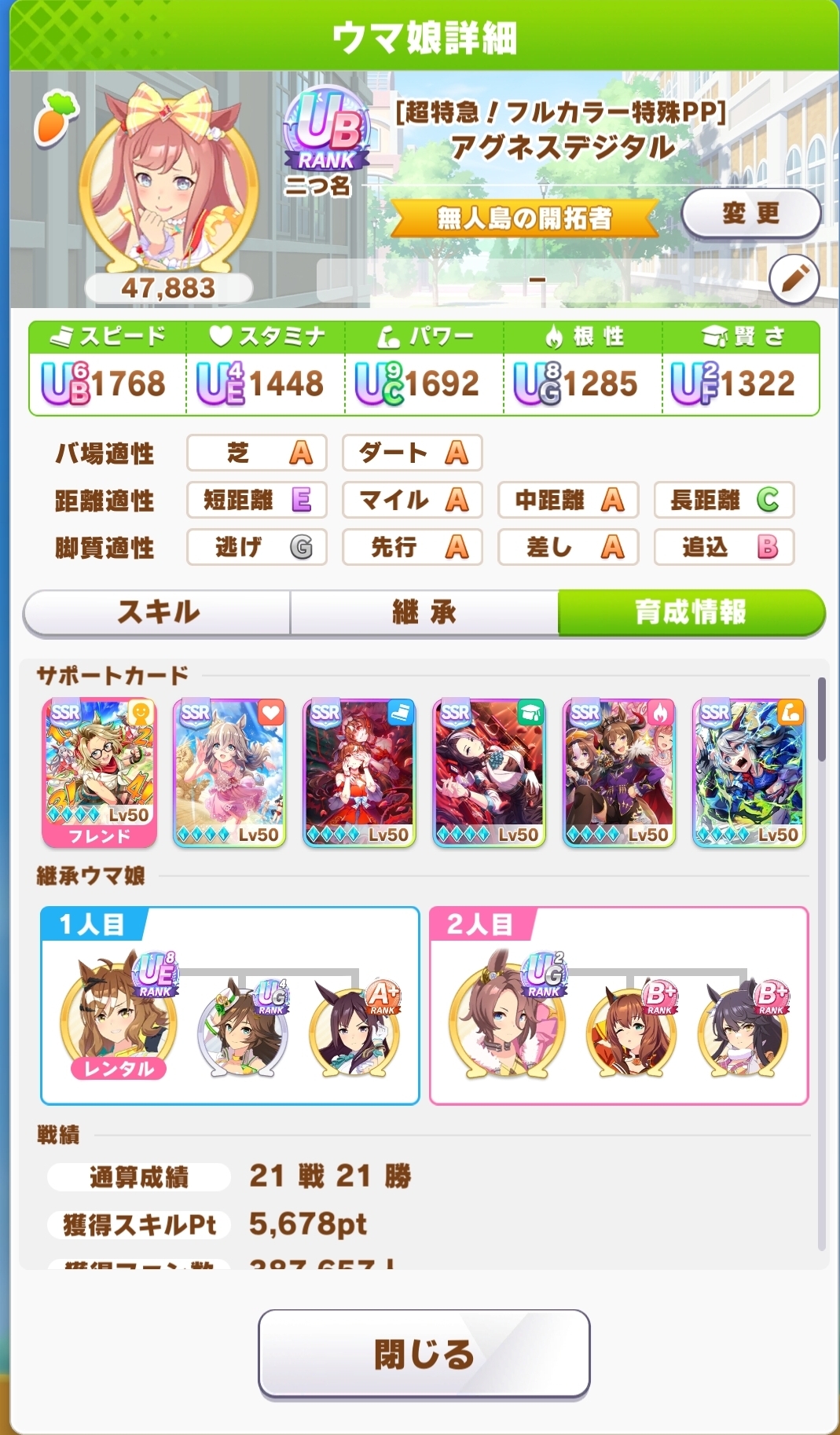 | … | 5025/09/17(水)11:06:01No.1354050816+スタギムレットでやってるなら金スキル中距離指定だし得意率低いしで無人島長距離育成には向いてないよ |