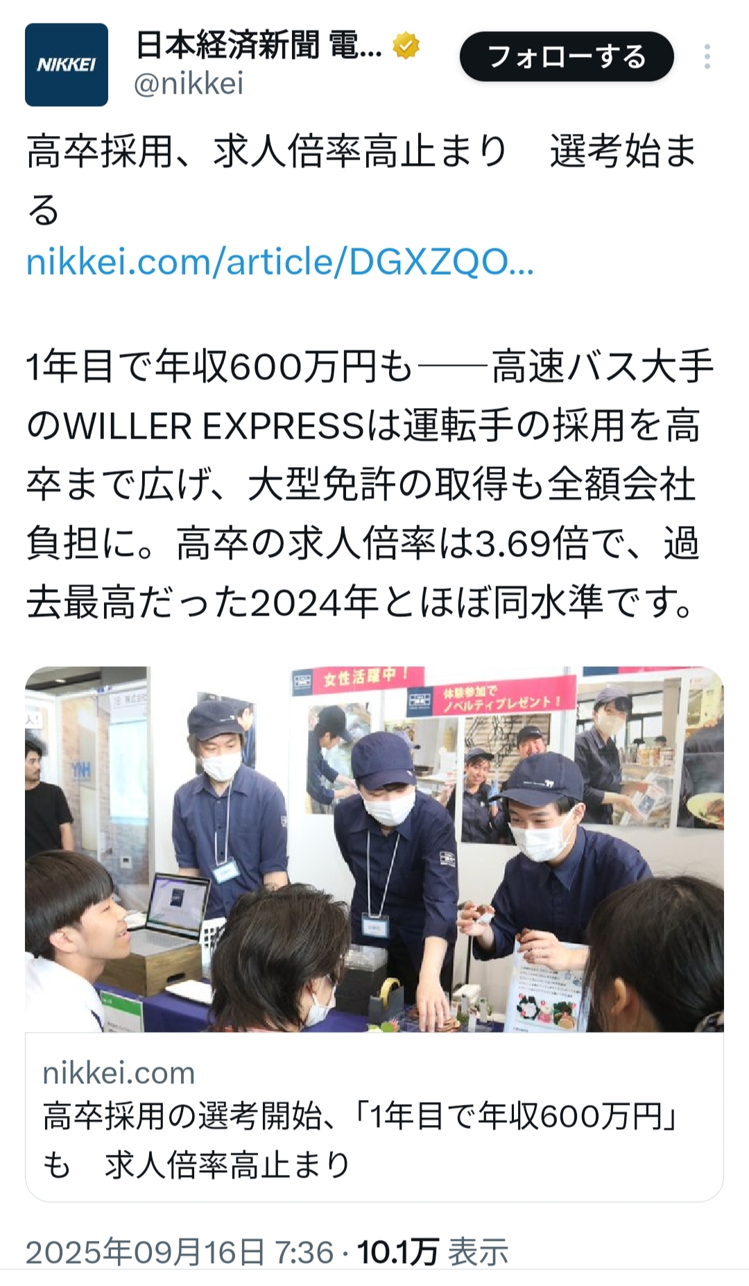 | … | 30125/09/17(水)11:35:45No.1354056067+>スレ画の会社は免許持ってない高卒も採用して会社で大型まで取らせる予定だからかなり気合入ってるぞ |