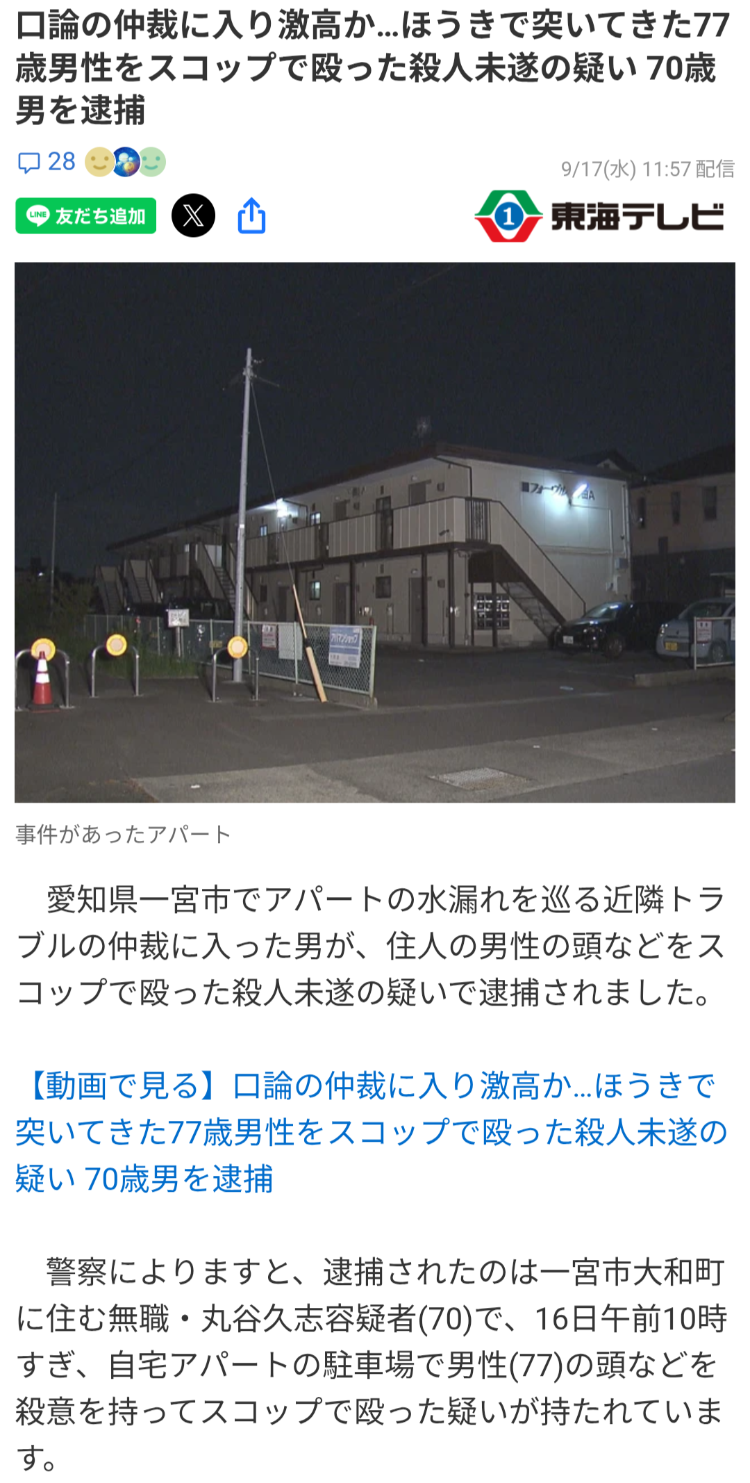 | … | 925/09/17(水)13:49:57No.1354091391そうだねx10> 丸谷容疑者は自ら「スコップで数回殴った」と警察に通報していて、調べに対して「弁解する余地はありません」と供述しています。 |