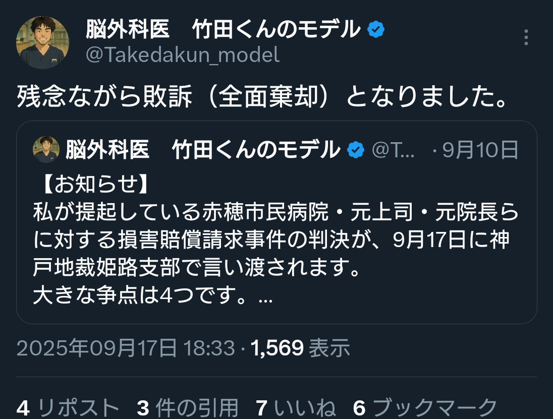 私が提起している赤穂市民病院・元上司・元院長らに対する損害賠償請求事件の判決が、9月17日に神戸地裁姫路支部で言い渡されます。