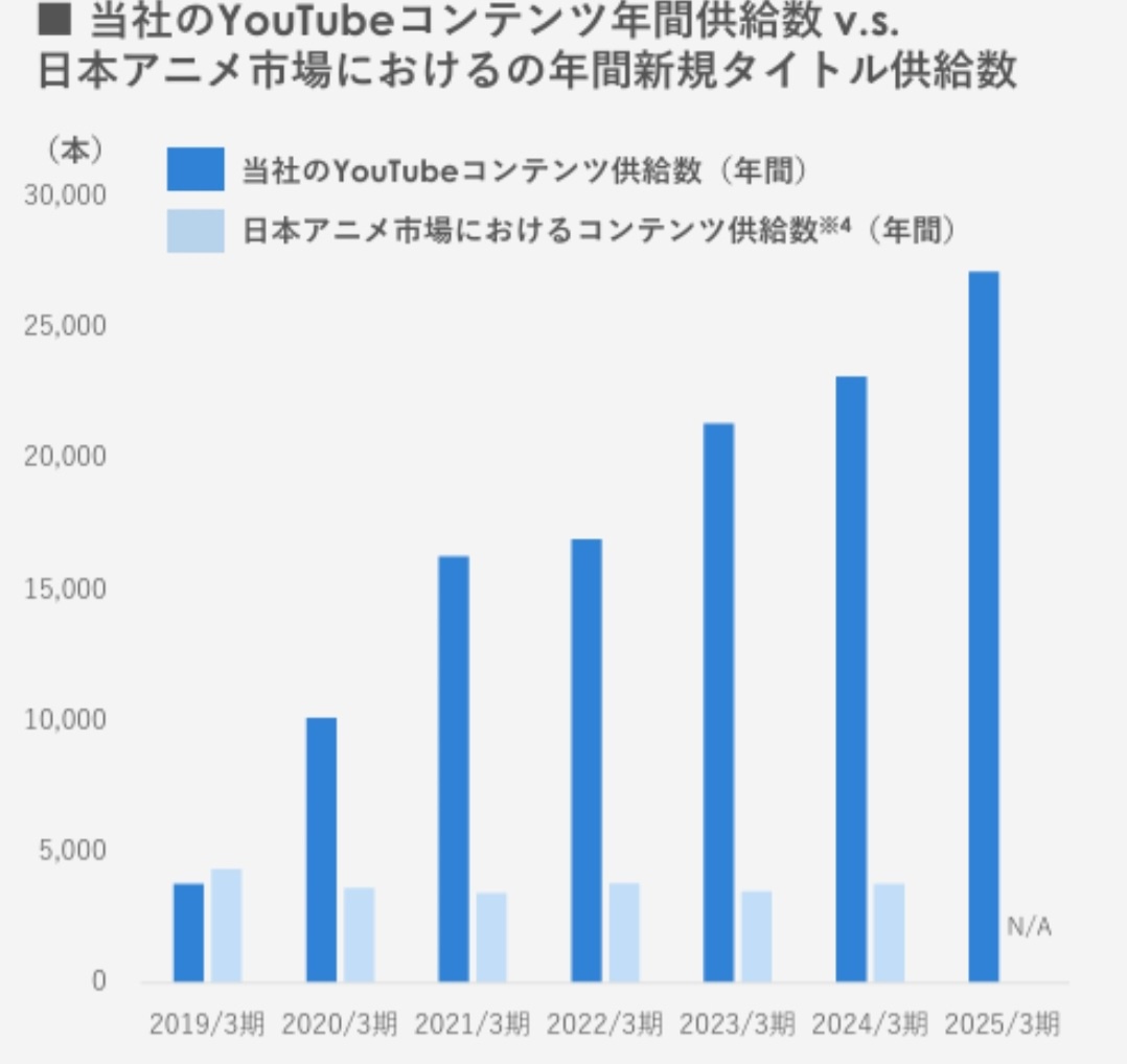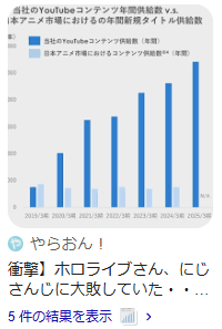 | … | 3225/09/17(水)20:02:37No.1354183872そうだねx1元の資料見れば最近アニメ産業が伸びていてVはアニメ関連産業と近似した市場構造でコンテンツ供給力が比較的に高いからアニメ産業の拡大に合わせて市場の拡大とファン層の拡大に期待できますよってアピールって普通に読み取れるだろ |