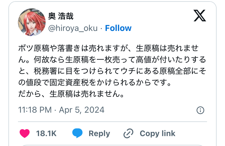 | … | 2325/09/17(水)18:36:57No.1354153603そうだねx6その理屈ならボツ原稿や落書きにも税金かかるだろ |