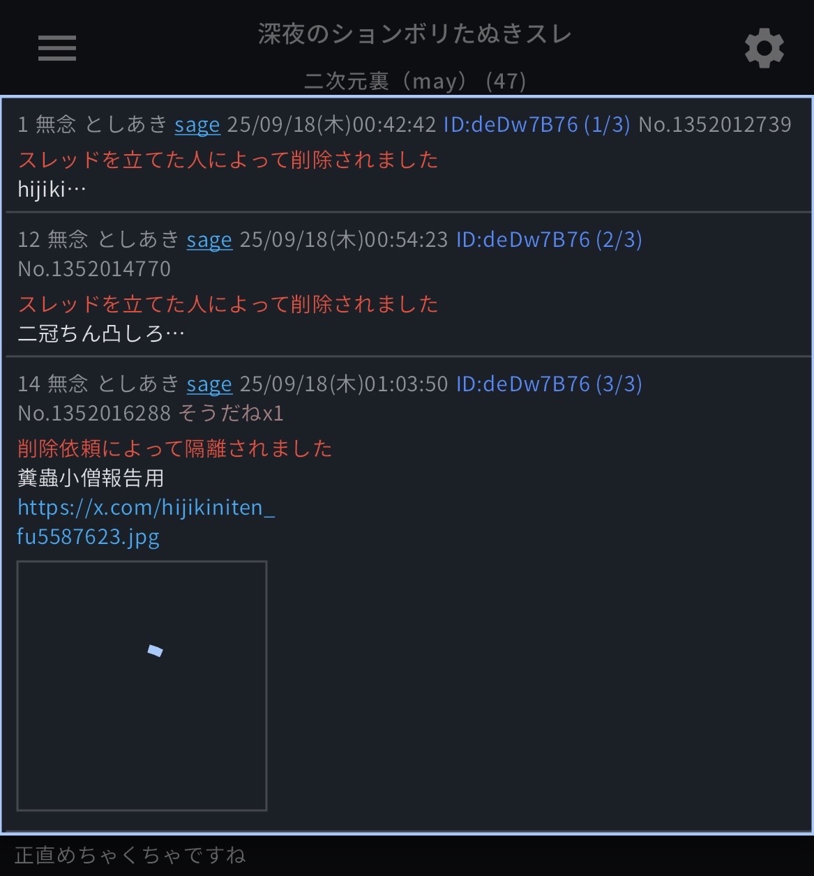 | … | 24225/09/18(木)12:23:11No.1354367685+正論だけど拡散されると困るのか… |