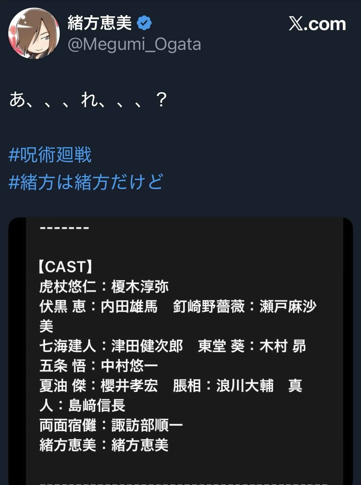 | … | 5425/09/19(金)13:22:22No.1354675638+https://x.com/Megumi_Ogata/status/785464674519162880 |