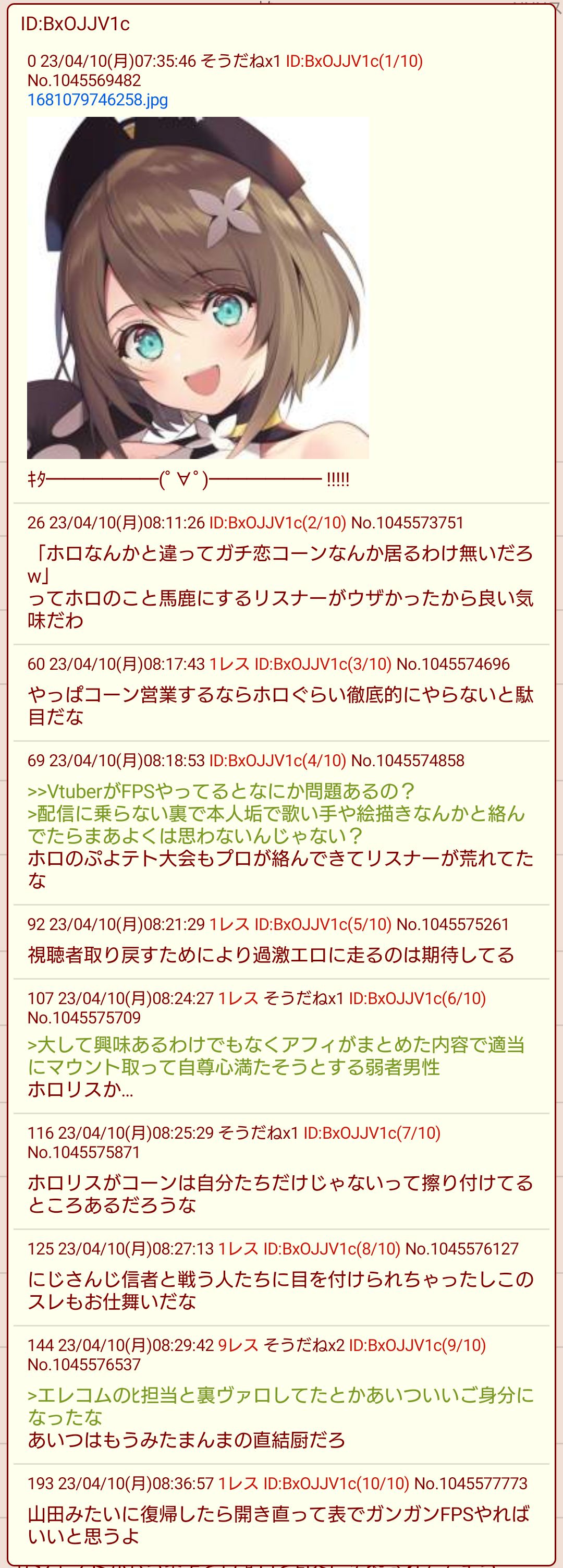 | … | 43225/09/20(土)10:22:35No.1354939924そうだねx3>ぶっちゃけかなえ先生嫌ってるのってホロリスだけであおぎりは普通に仲良いしリスナーもコラボ望んでるけどね |