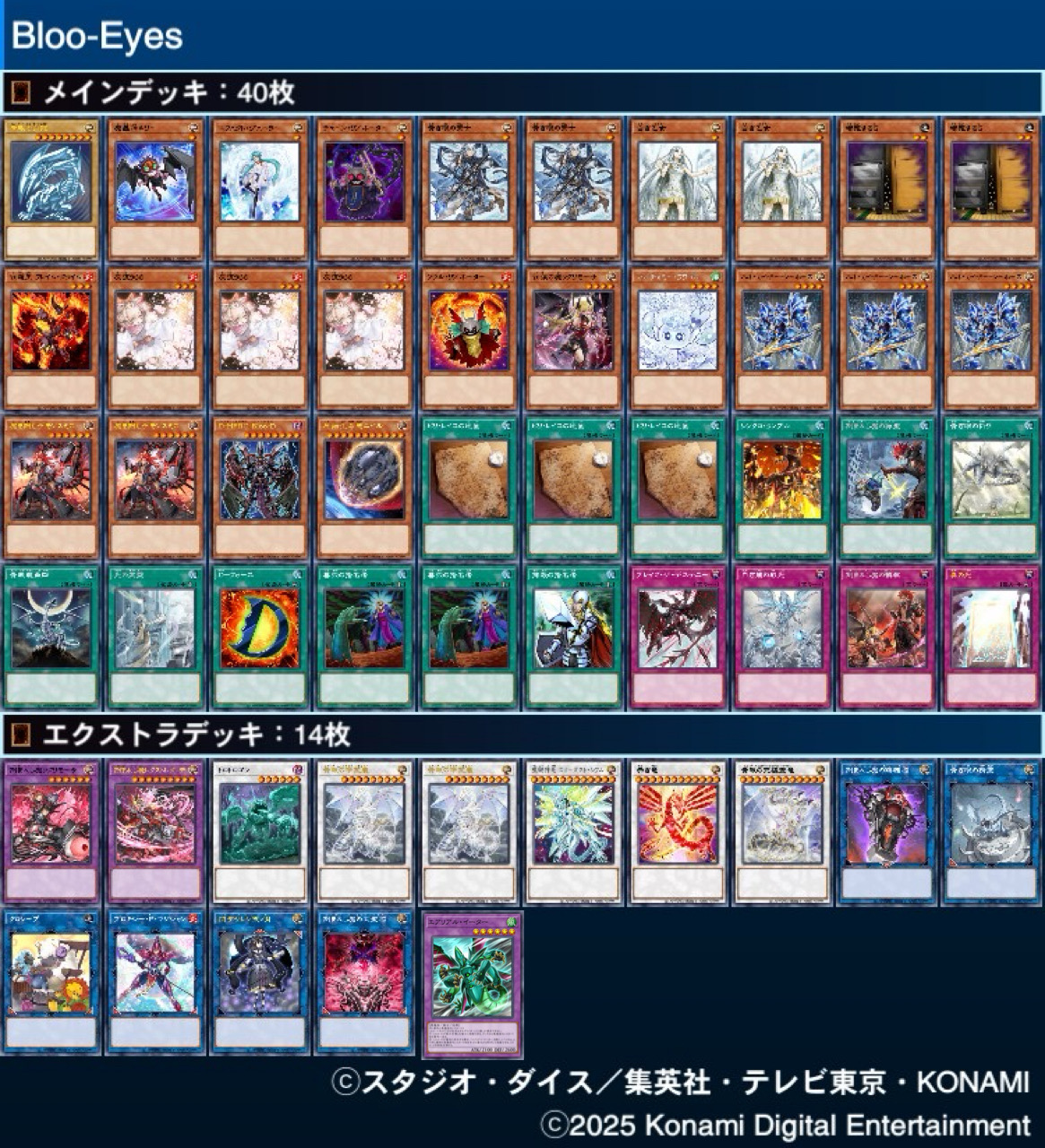 | … | 6425/09/21(日)12:50:14No.1355335208+>特に青眼は究極霊竜・シフル・Bloo-Dの並びになるので壮観です |