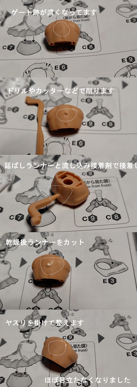 | … | 13725/09/21(日)21:34:00No.1355507612+>ヤスってもヤスっても残る白い跡?ゲート跡?はどうすればいいのだろうか ゲートを少し残して切れ味のいいデザインナイフで左右から力を入れずバランス良く切れば白化はほとんどしない |