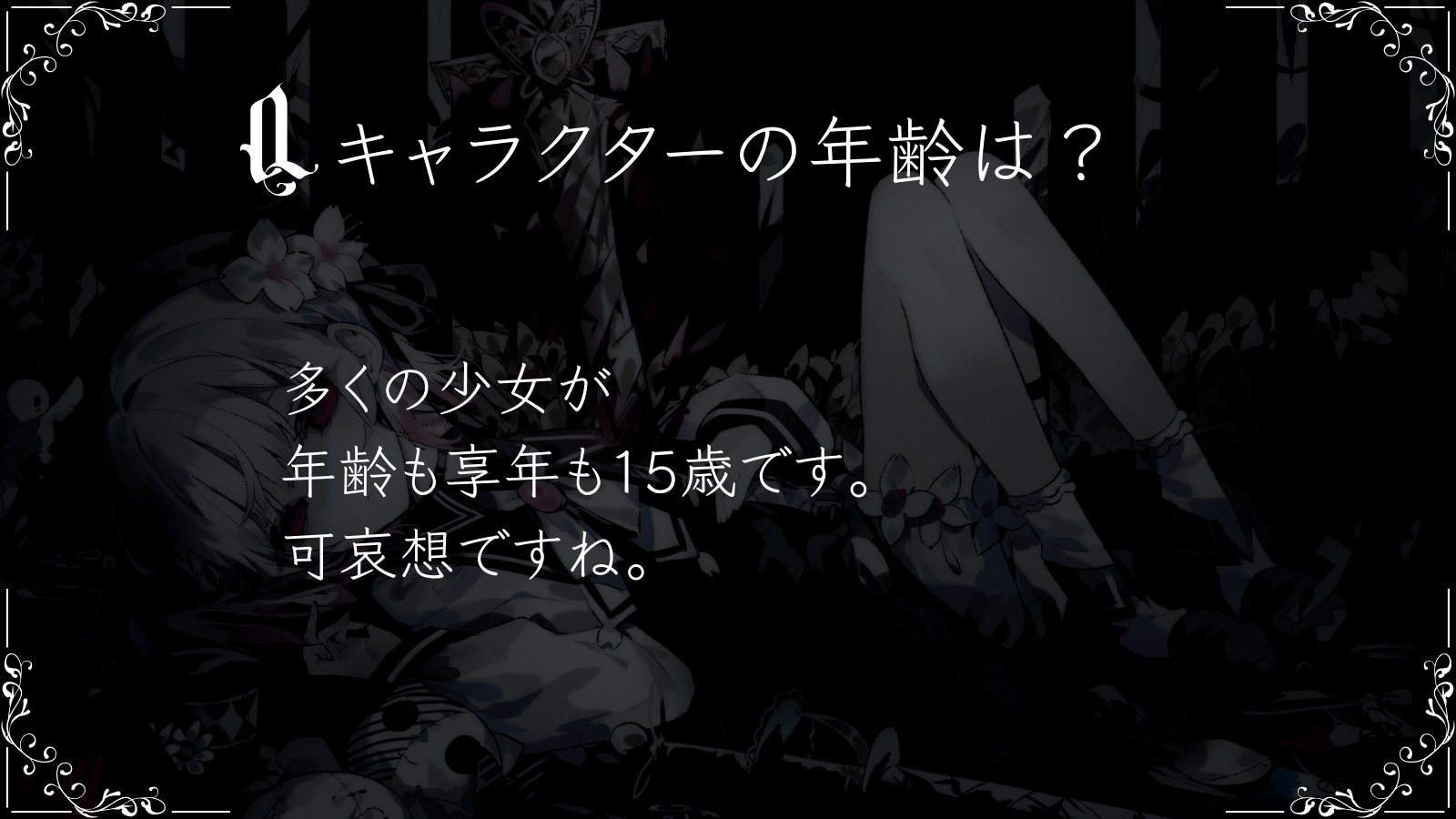 | … | 7925/09/23(火)00:12:42No.1355876932+この中に年齢詐称をしている黒幕がいるわ |