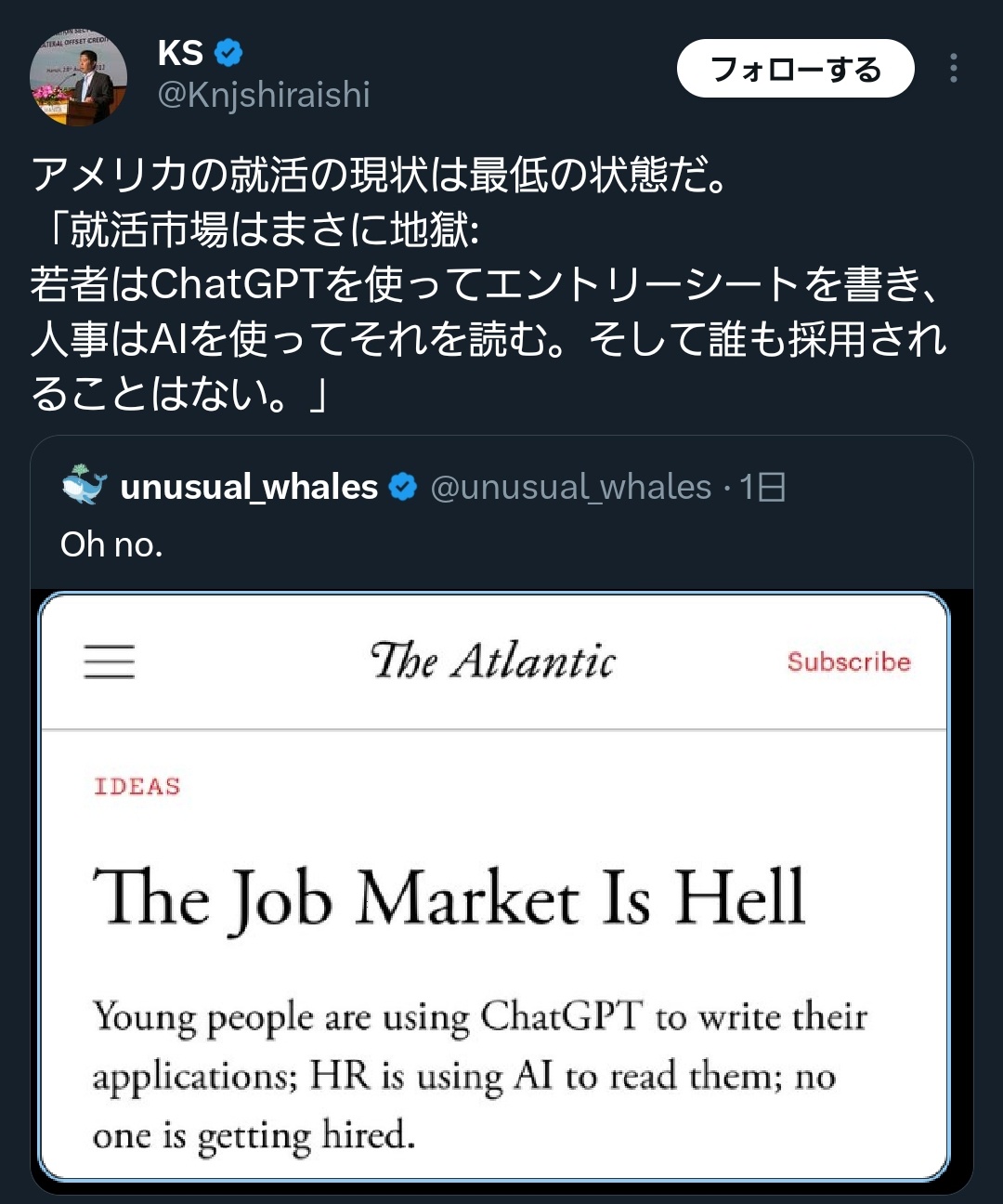 | … | 1025/09/23(火)11:23:26No.1355964521そうだねx1>3年前の時点で既にアメリカはインターン制度つかって新卒を無給で働かせないとビジネス成り立たんという超絶ブラックである |