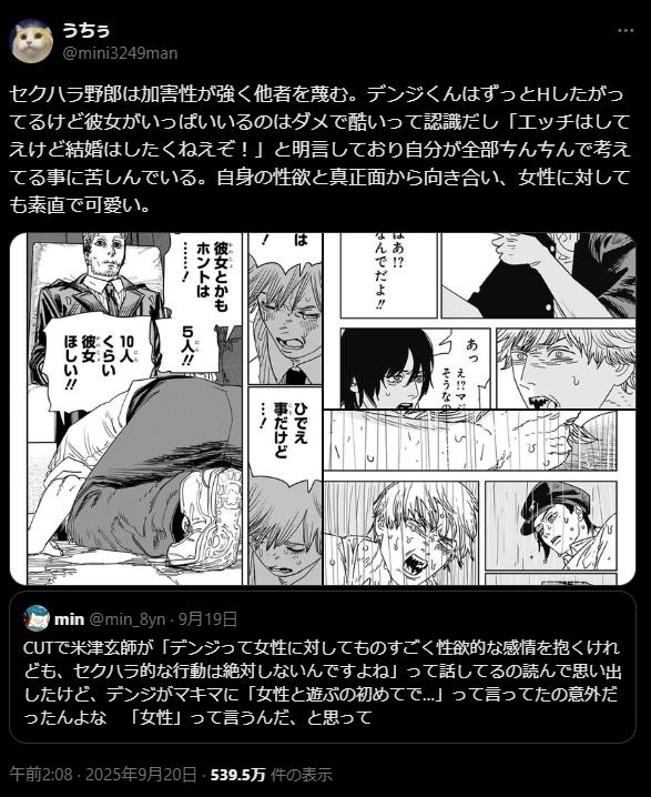 | … | 2725/09/23(火)17:57:22No.1356056889+>デンジの性欲に加害性がないならなんでシコってるだけのオタクって色々言われるんだろうな |