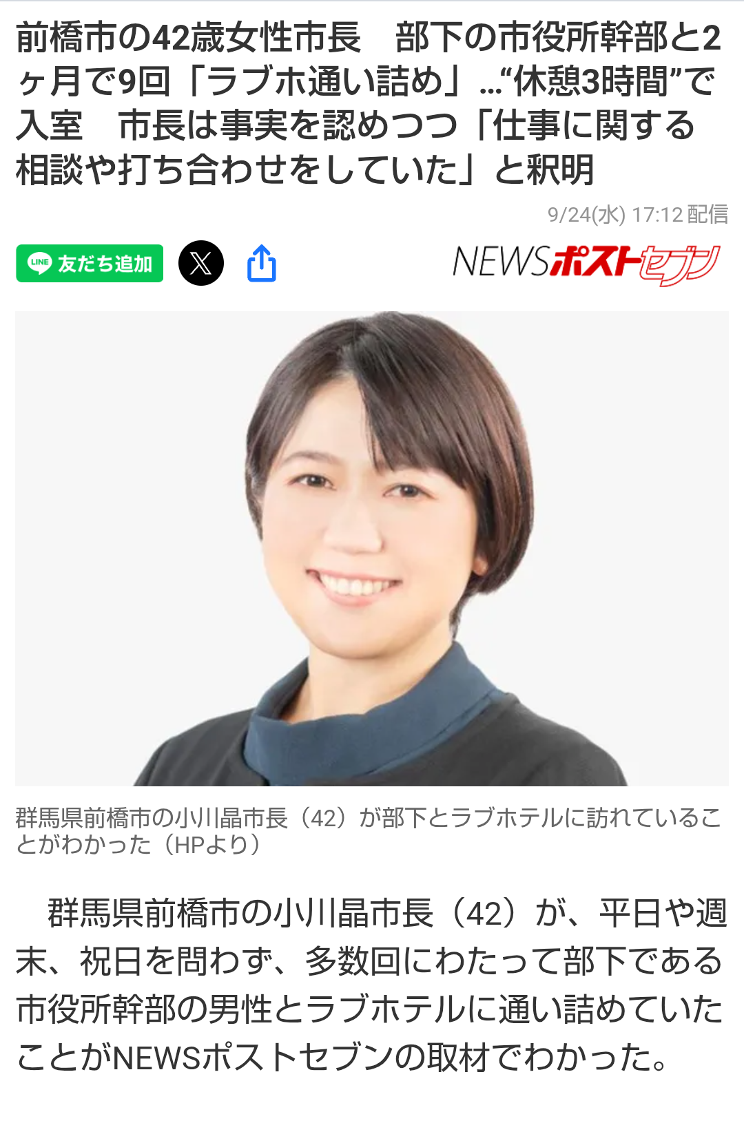 | … | 8925/09/24(水)18:44:01No.1356382565そうだねx1>2人がラブホ密会していた8月12日(火)は平日で、勤務時間中と考えられる時間帯での入室だったが、それについてはX氏は「私が有給休暇を取り、市長の私的な相談に応じておりました」と説明した。お盆の時期だから有休を取得していたのは不思議ではないが、市長は平日夜や土曜に加えて、男性が有休を取得した平日の日中まで2人きりの相談をしているようだ。 |