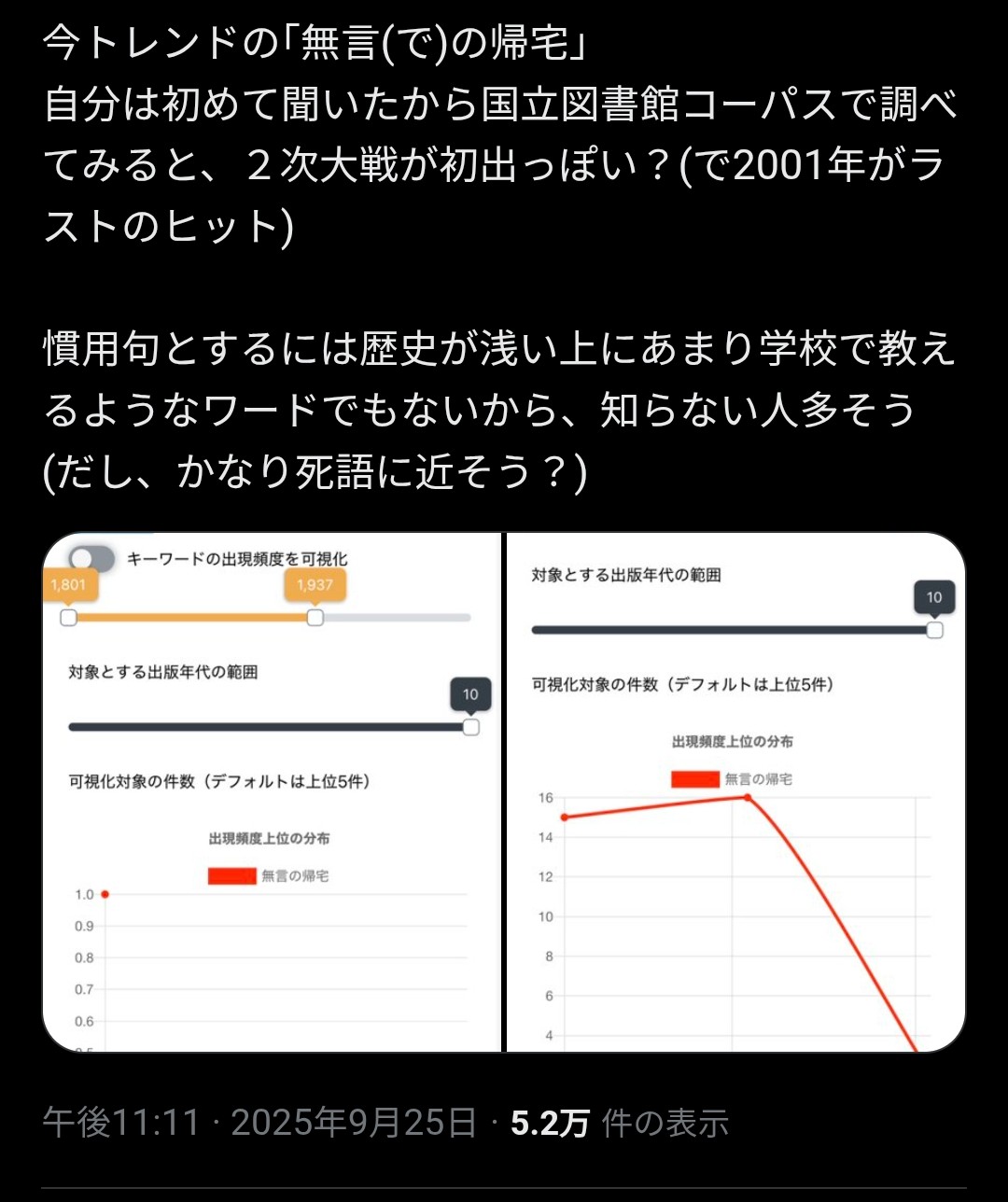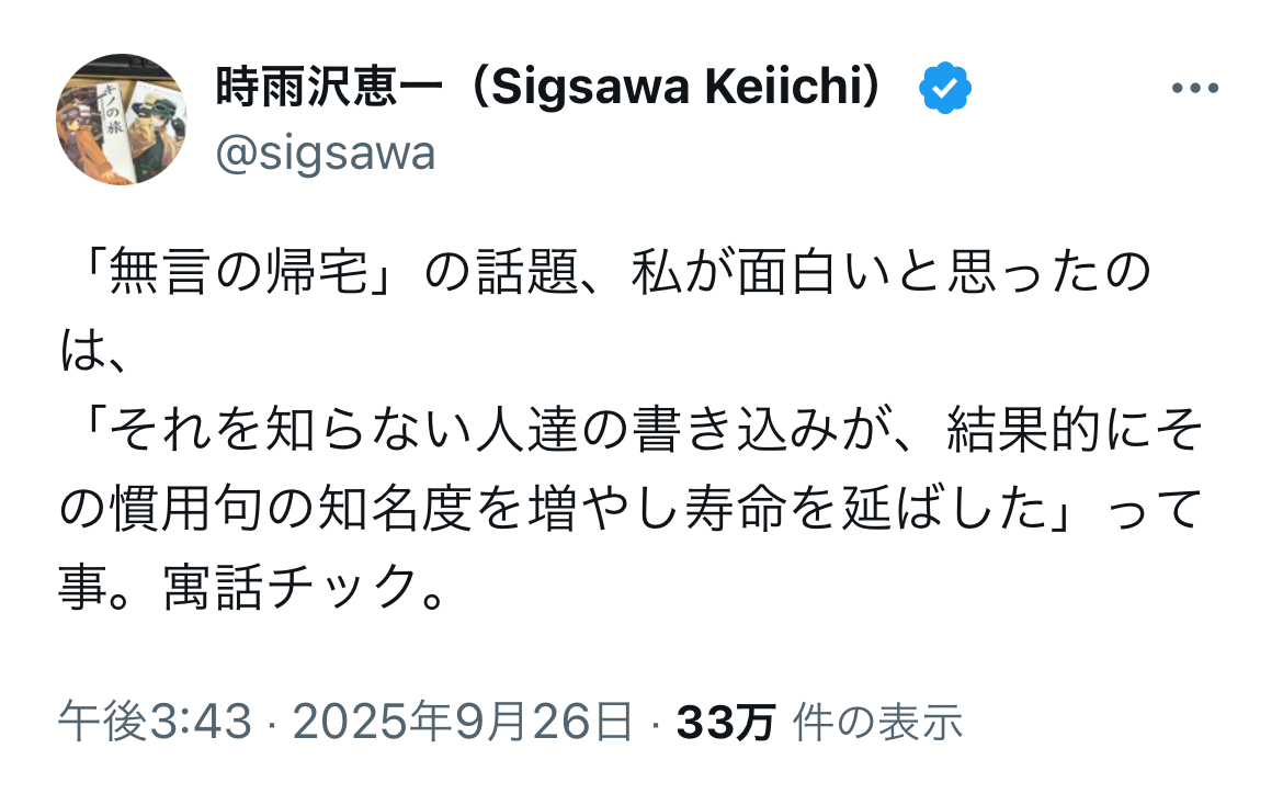 | … | 20025/09/26(金)23:53:19No.1357124000+無言の帰宅というワードが検索汚染されて実例が出てこなくなってしまったからな |