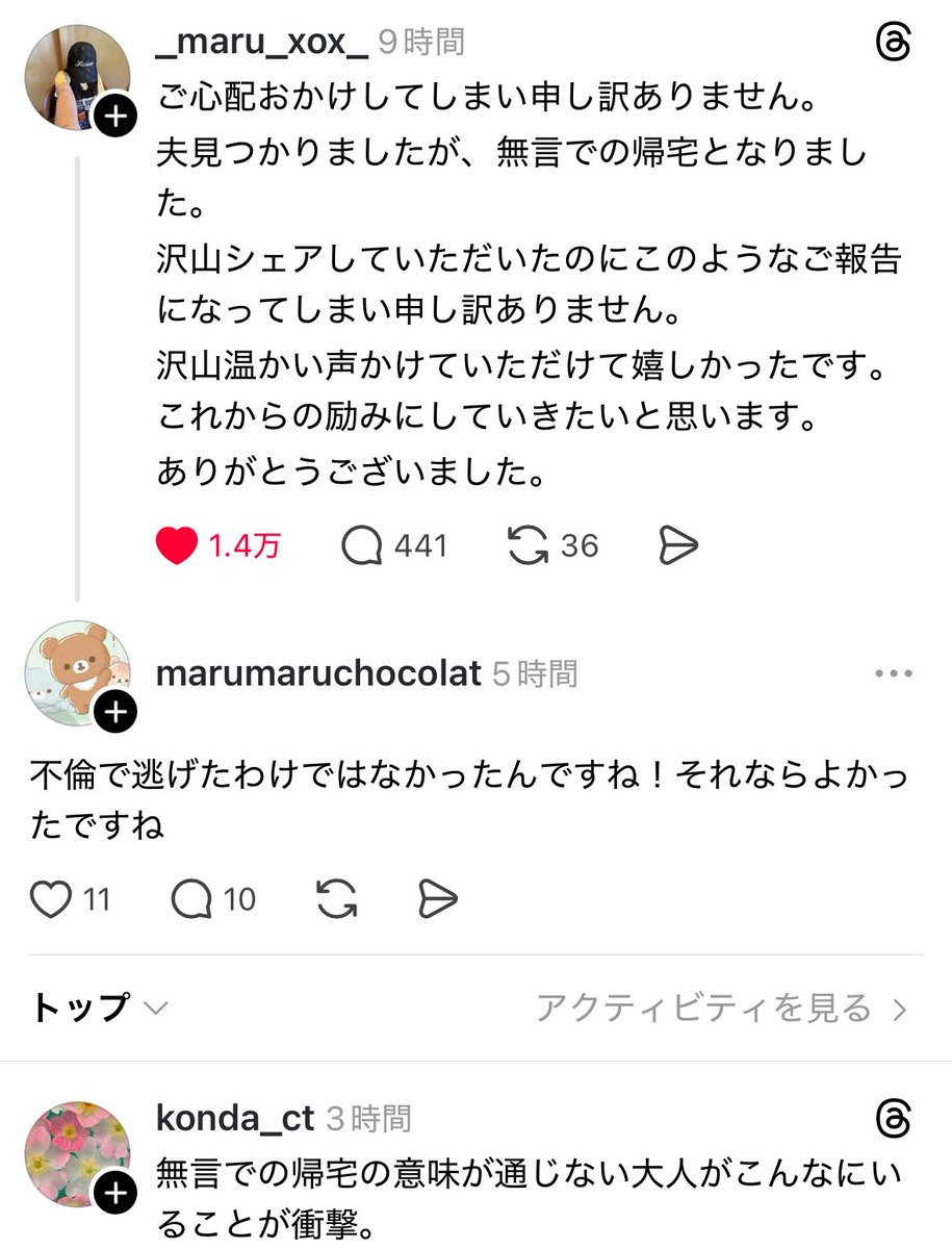 | … | 5325/09/26(金)23:37:59No.1357118838そうだねx1無言の帰宅に対してよかったですねって返した人は削除して謝ったんだろうか |