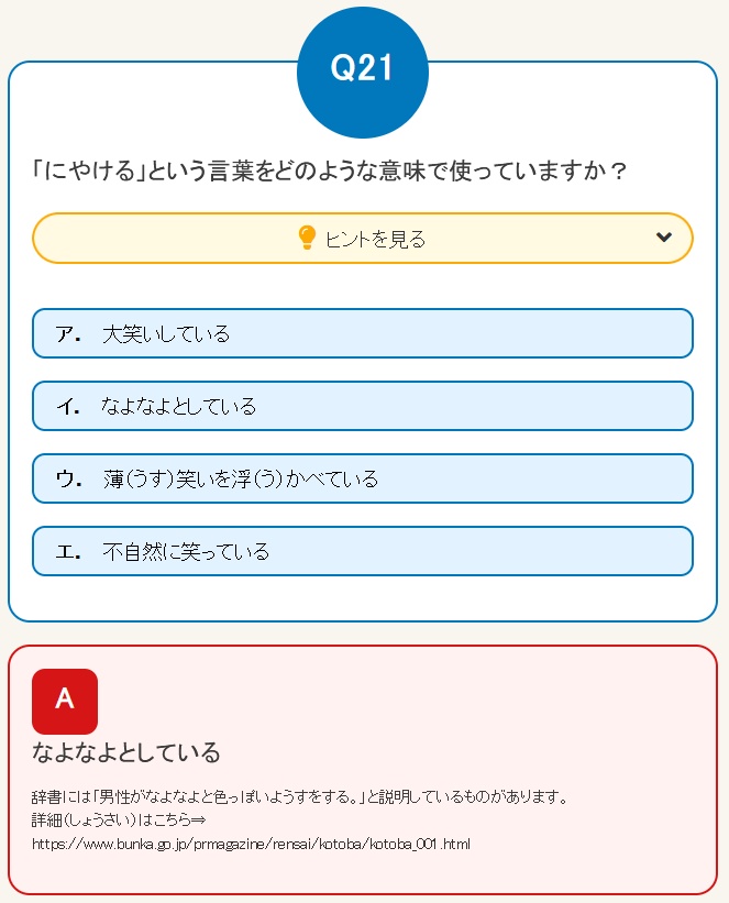 | … | 625/09/27(土)10:48:11No.1357215597+「にやける」本来の意味理解は1割、「付かぬ事」「潮時」「役不足」を異なる意味で使う人も…国語世論調査 |