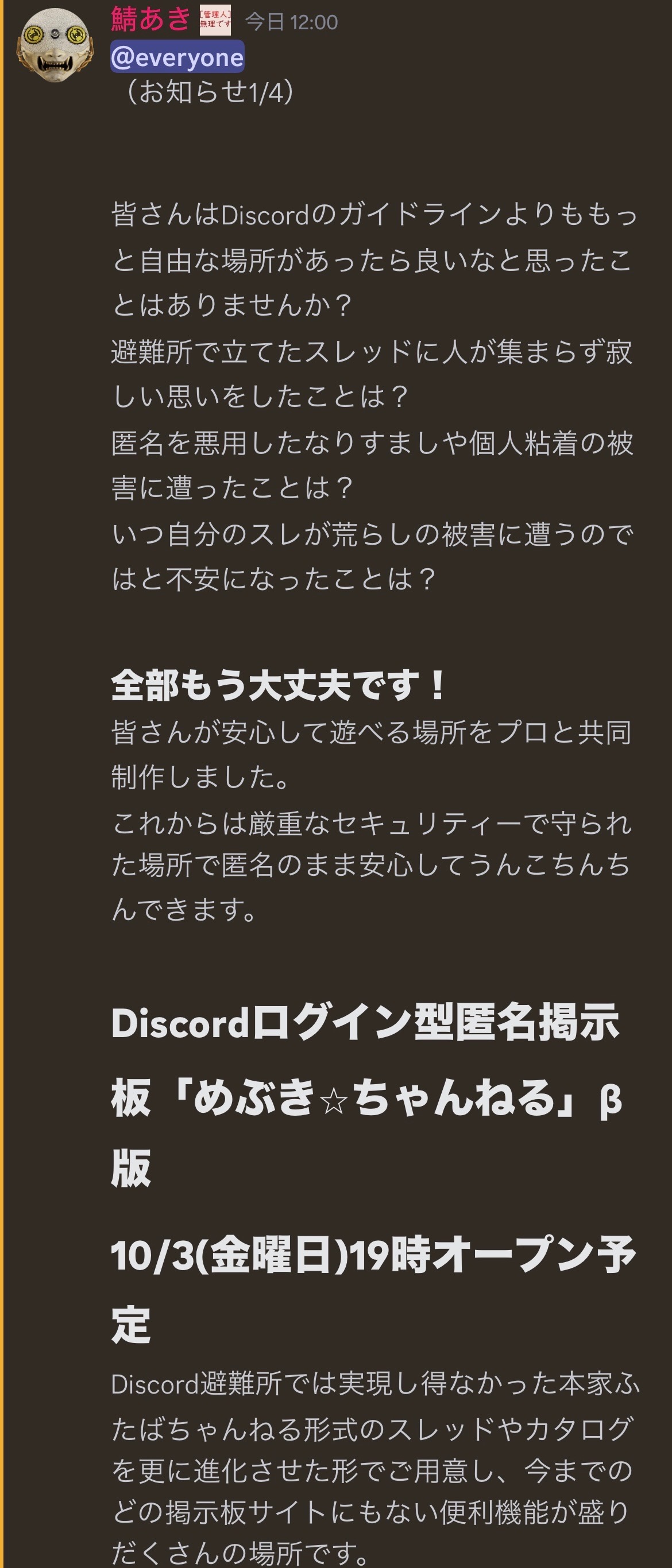 | … | 8125/09/28(日)01:38:48No.1357502270そうだねx1「バカ(荒らし)はくるな」ってのは避難所と同じ |
