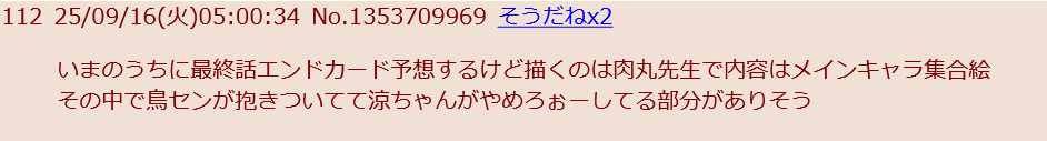 | … | 12125/09/29(月)03:56:12No.1357910834そうだねx1そういえば最終話エンドカードの予想当たってたね |