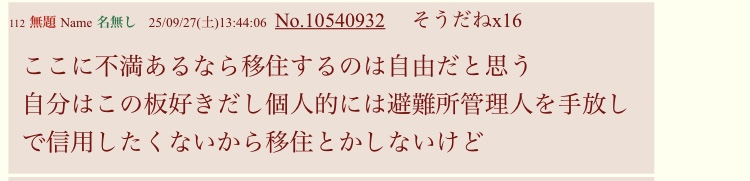| … | 59025/09/29(月)14:54:32No.1358011382そうだねx13>避難所がもうダメだから次の巣を作ろうとしてるだけにしか見えないんだよね |