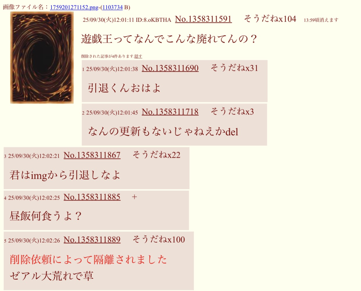 | … | 1025/09/30(火)17:49:29 ID:zGkkKxU6No.1358392386そうだねx1削除依頼によって隔離されました |