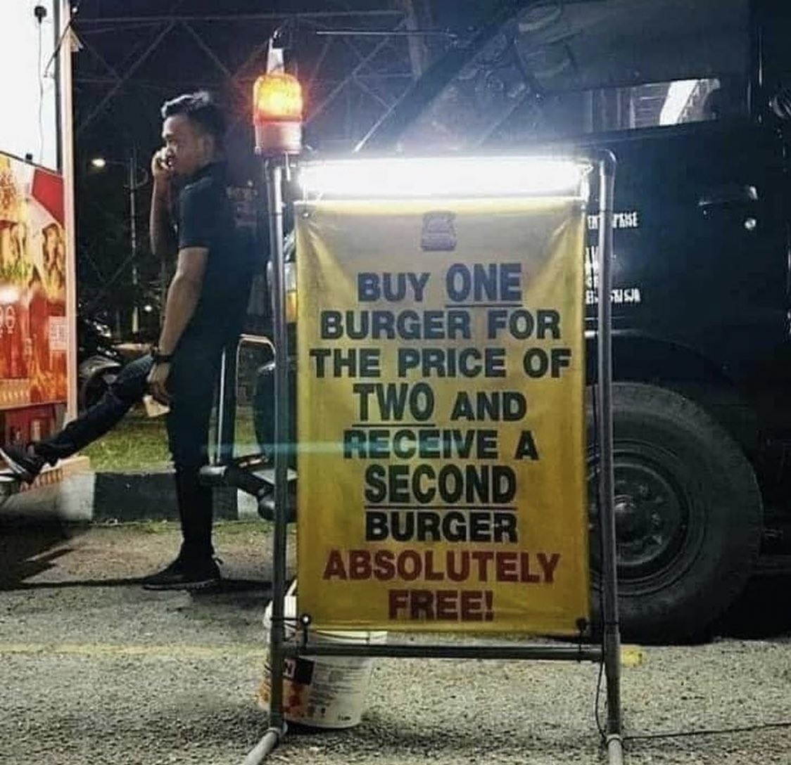 二個分のバーガーのお金でバーガーを一個買えば二つ目のバーガー無料!ってことか