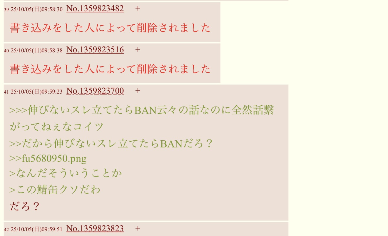| … | 4125/10/05(日)09:59:23No.1359823700+>>>伸びないスレ立てたらBAN云々の話なのに全然話繋がってねぇなコイツ |