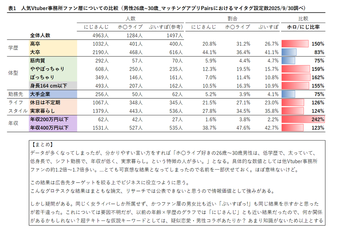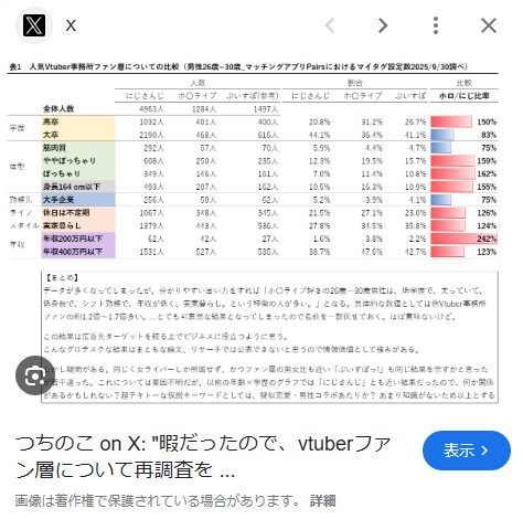 | … | 525/10/06(月)19:50:12No.1360301660そうだねx20どんだけにじさんじリスナーはマチアプ利用者が他所の3倍多いことアピールしたいんだよ |