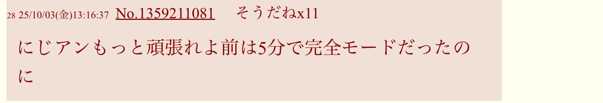 | … | 4425/10/07(火)13:30:37No.1360513853そうだねx2>まぁにじ粘着ではあると思うよ |