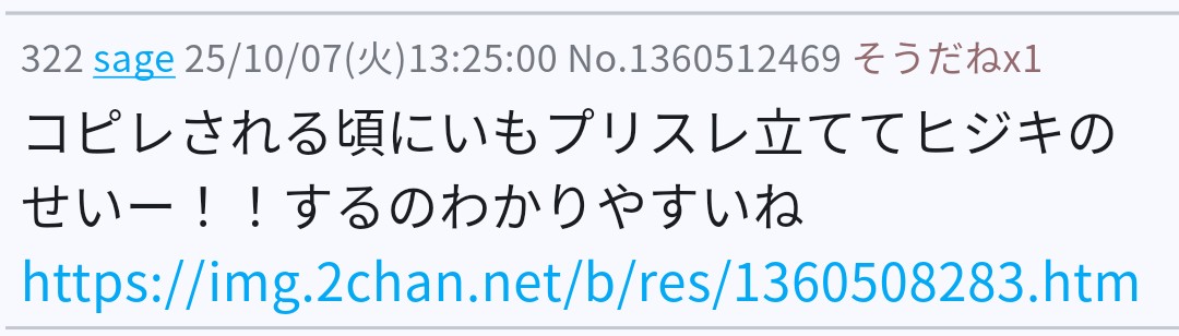 | … | 25125/10/07(火)14:12:50No.1360523201そうだねx1>>荒らしにも渾身の造語があったはずなんだがな… |