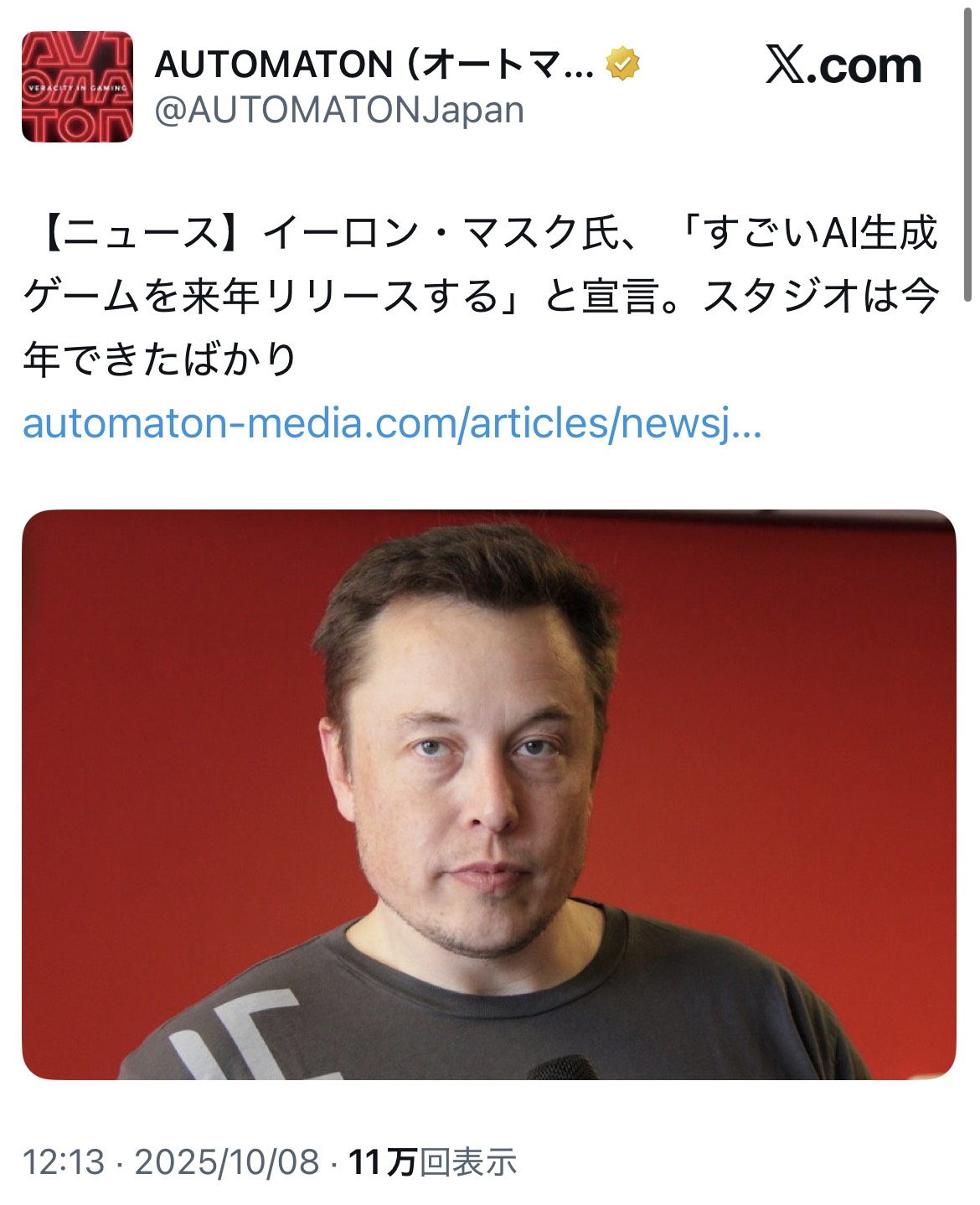 | … | 3825/10/08(水)17:09:38No.1360853900そうだねx19>結果GrokとかAniが産まれてるし |