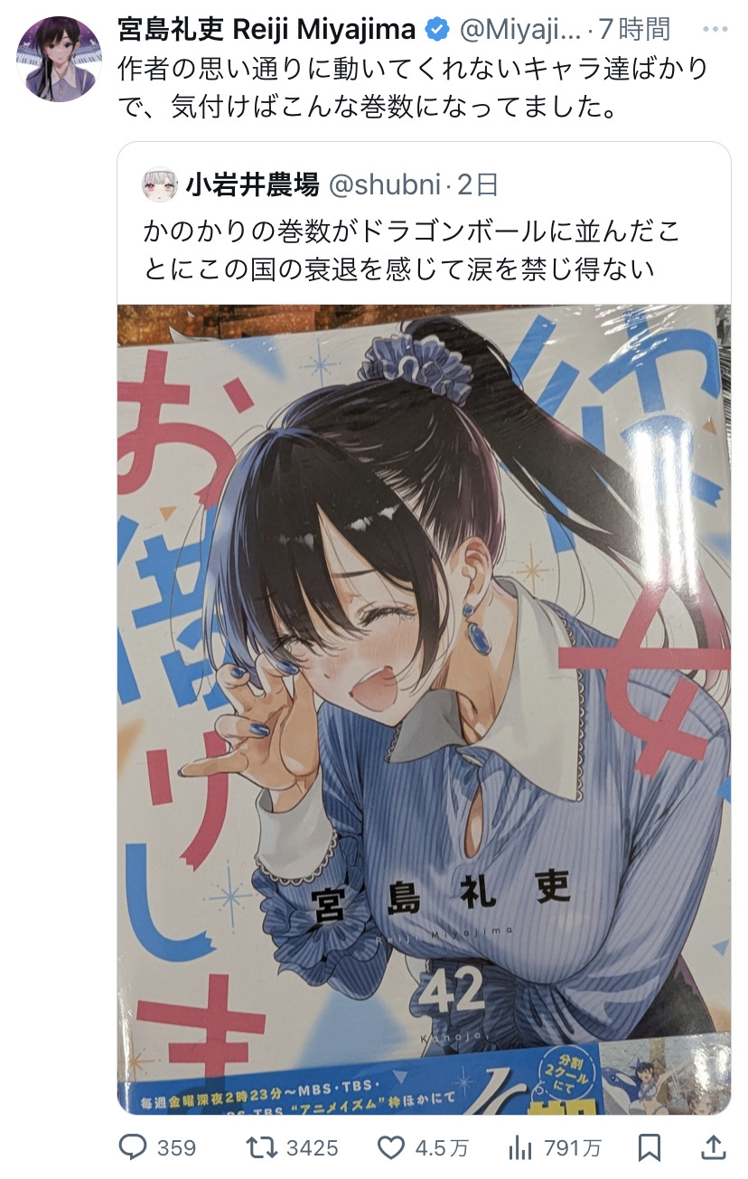 | … | 21025/10/08(水)19:13:23No.1360887989そうだねx1>>ラブコメで42巻って歴史的に見てもすごくない? |