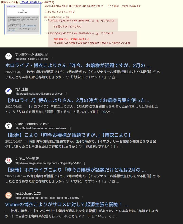 | … | 725/10/08(水)22:59:25No.1360980954そうだねx1もう見てないけどこよりってまだなんJの姫やってるのかな |