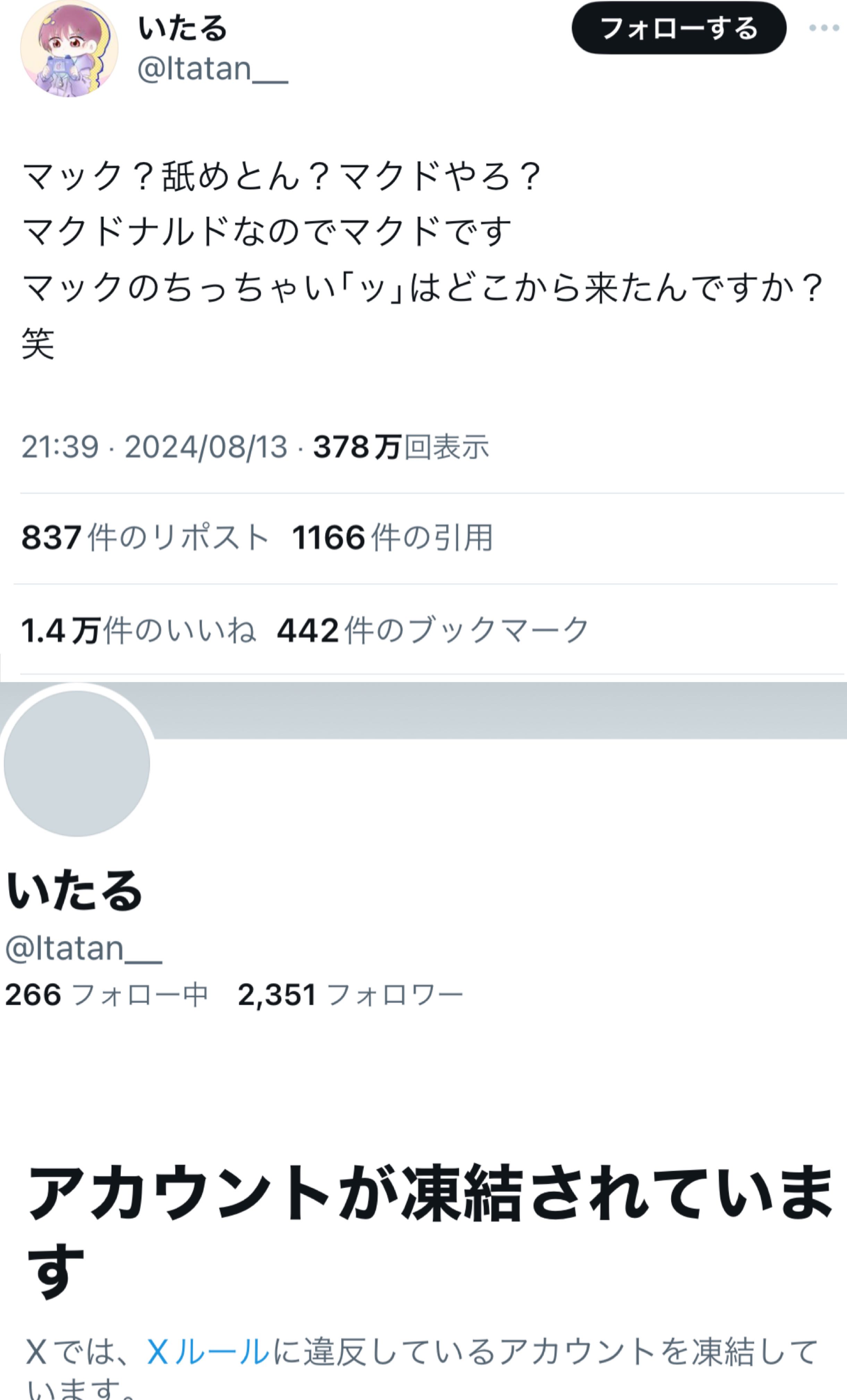 | … | 1725/10/09(木)13:53:39No.1361118803+>>フランス語では、発音が日本と同様になることに加えて、「マック」は「売春の仲買人」や「ポン引き」を意味する隠語になることから、「マクド」と略されている |