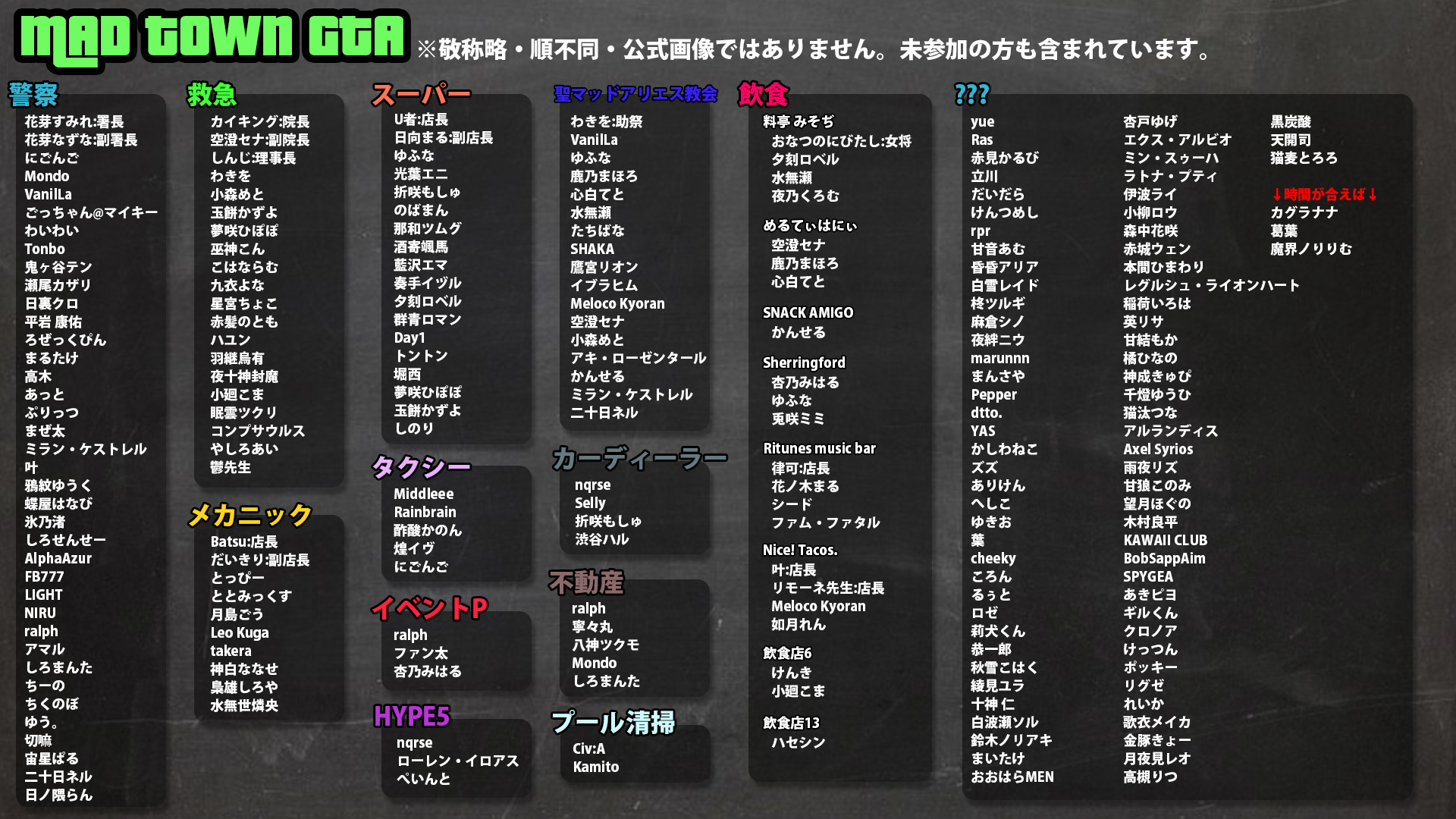 | … | 5525/10/12(日)05:02:46No.1361971702+ストグラの方でやれてなかったし顔見知り結構いるっぽいから警察でもやるんかな |