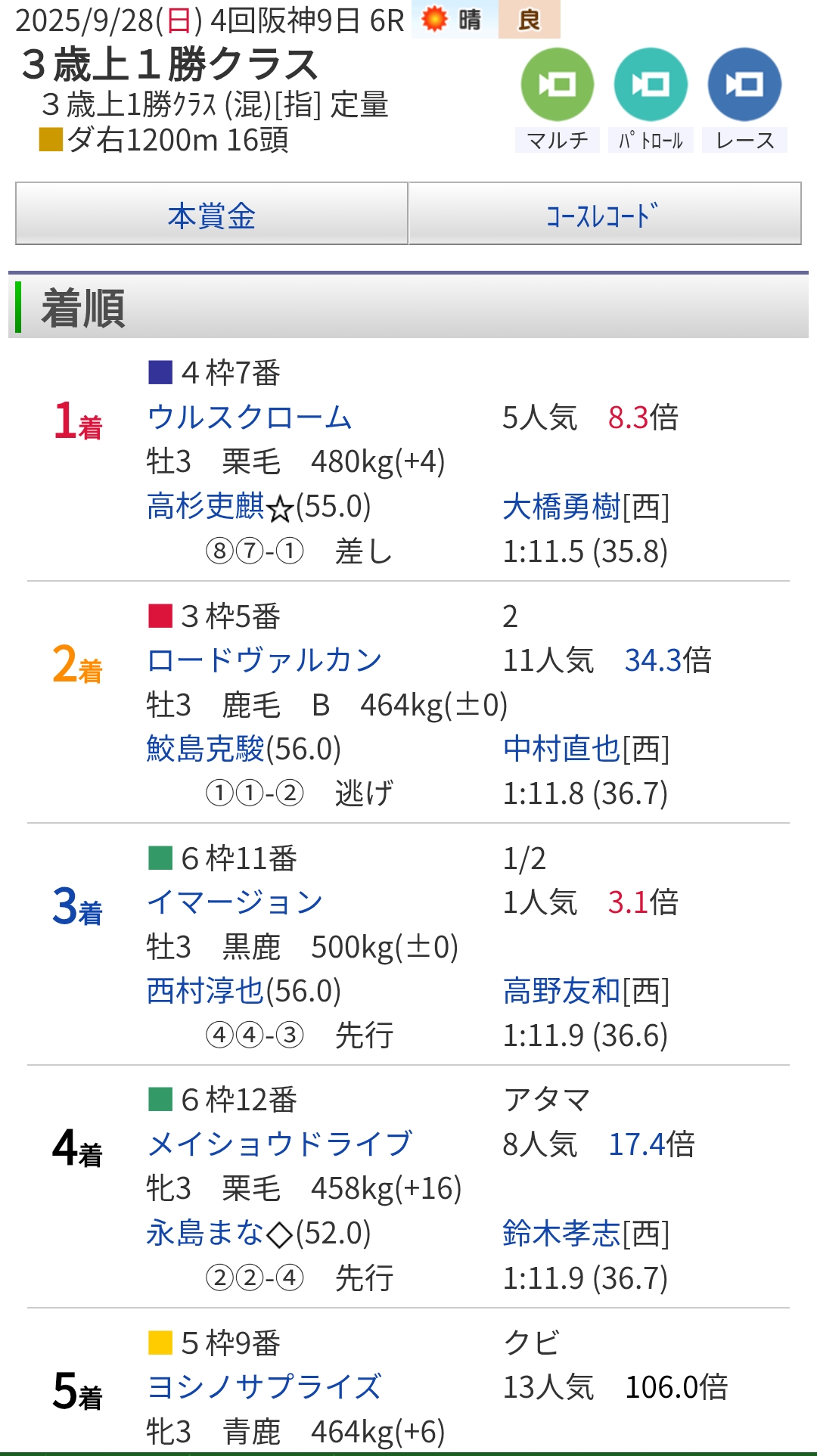 | … | 4425/10/12(日)12:43:36No.1362050551そうだねx1イクシードおめでとうございます!大外スタートからよれて後方勢だったのに最後にノーステッキで纏めて差しきるのは強いですね! |